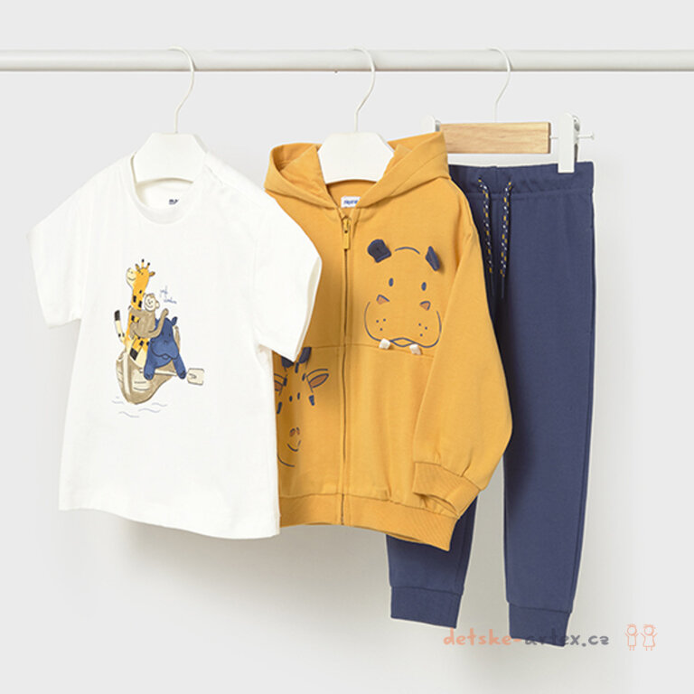 Souprava Mayoral s mikinou, tepláky a tričkem se zvířátky, pohodlná, kvalitní a odolná pro aktivní batolata.