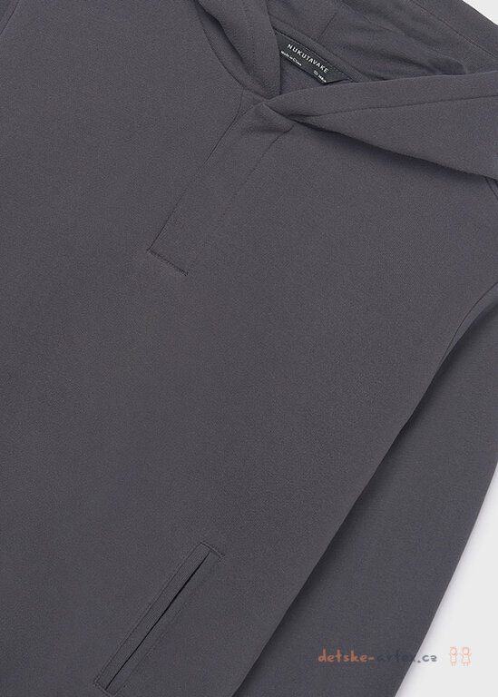 Teplá mikina je jednobarevná v elegantní tmavě šedé barvě a nemá žádný potisk, což ji činí snadno kombinovatelnou s ostatním oblečením. Pohodlná kapuce je podšitá jemnou bavlnou, která zaručuje příjemný pocit při nošení. Praktické přední kapsy poslouží k bezpečnému uschování drobností či zahřátí rukou. Mikina je zateplená jemným počesem z rubové strany, což výrazně zvyšuje její tepelný komfort. U krku je zapínání na dva patenty.