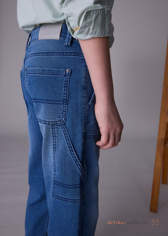 Džíny mají originálně řešené kapsy, které dodávají moderní vzhled a praktickou funkčnost. Díky kvalitnímu materiálu jsou odolné a vhodné pro každodenní nošení. Pas je možno upravit pomocí pruženky a knoflíku z rubové strany.