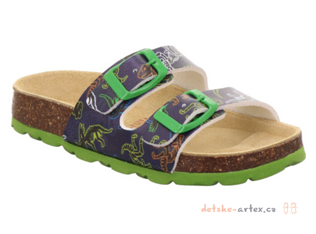 Zdravotní pantofle korkáče s koženou stélkou a obrázky dinosaurů jsou ideální chlapecké přezůvky na doma i do školy. Anatomicky tvarovaná stélka s podporou podélné i příčné klenby napomáhá správnému držení klenby chodidla. Kvalitní obuv na přezutí od rakouského výrobce Superfit.