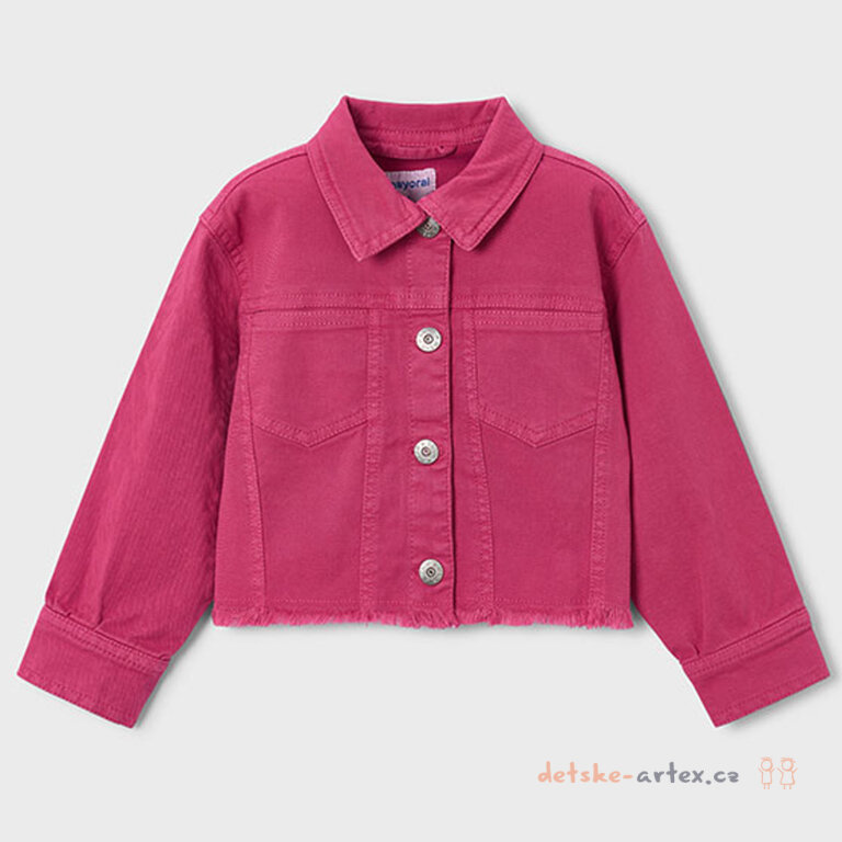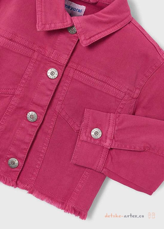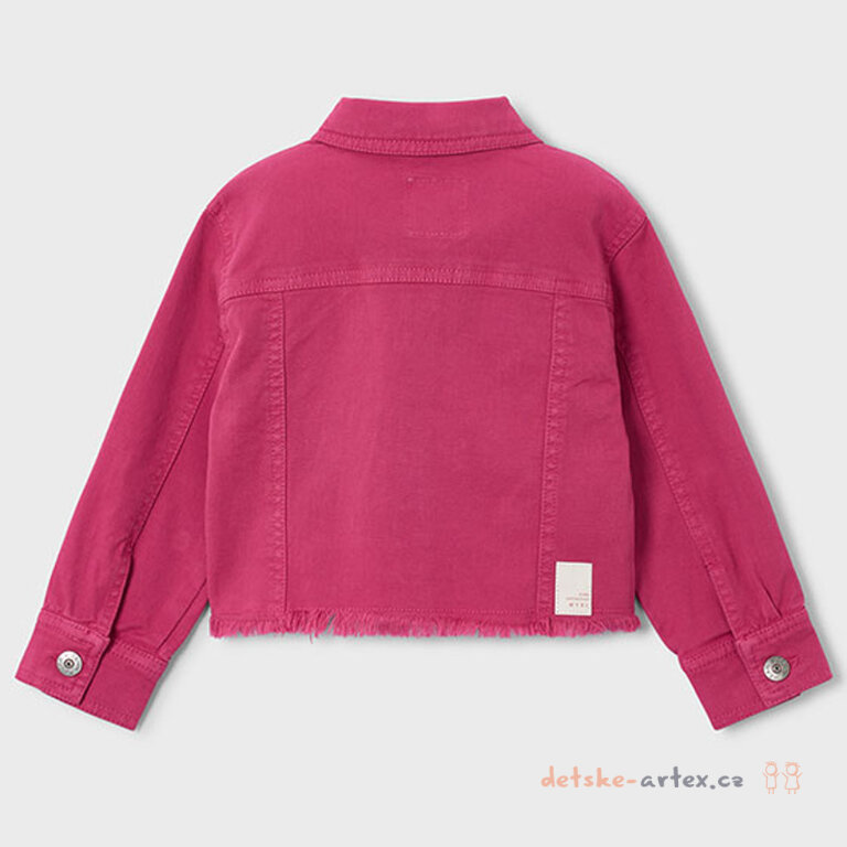 Dětská džínová bunda Mayoral v tmavě růžové barvě s praktickým zapínáním na patenty je skvělým doplňkem k letnímu oblečení.