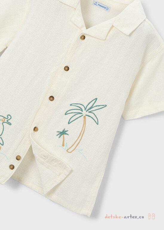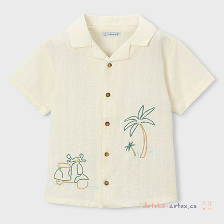 Dětská letní košile s výšivkou Mayoral 3114-22 je pohodlná a stylová pro horké dny. Vyrobena z lehkého, vzdušného materiálu pro dobrou prodyšnost a příjemný pocit na pokožce. Design doplňuje letní vyšívaný motiv, který košili dodává originální vzhled. Košile s krátkým rukávem se hodí i jako ležérní letní doplňek přes tričko.