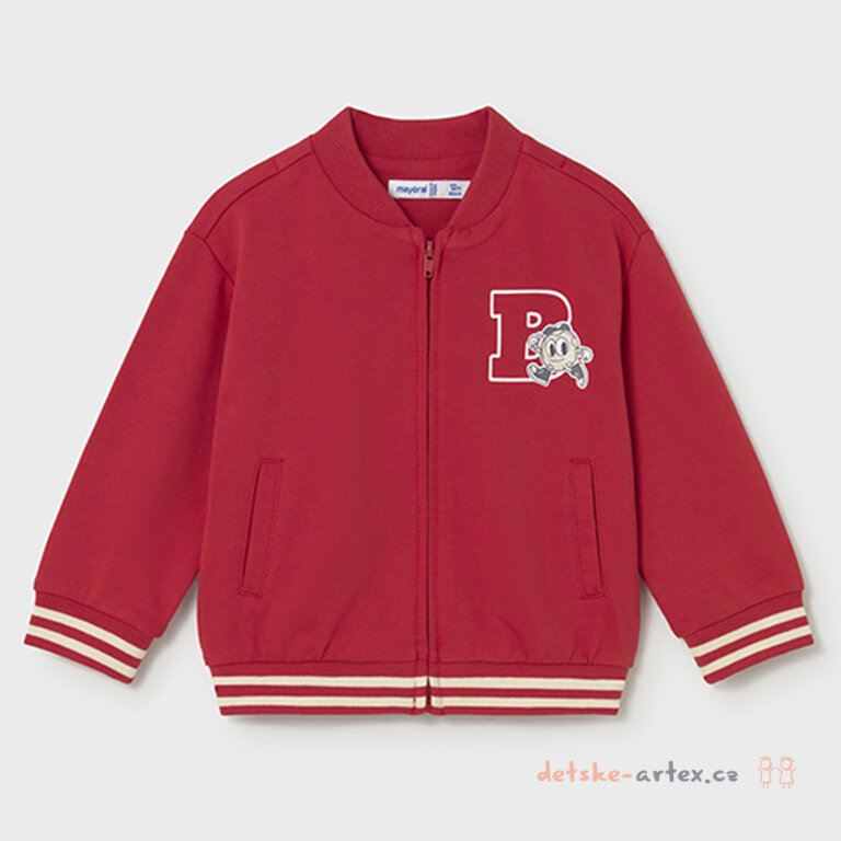 Dětská mikina na zip bez kapuce Mayoral 1406-32 je praktickým kouskem pro každodenní nošení. Červená mikina má na přední i zadní straně veselý obrázek, který dodává mikině hravý a originální vzhled.