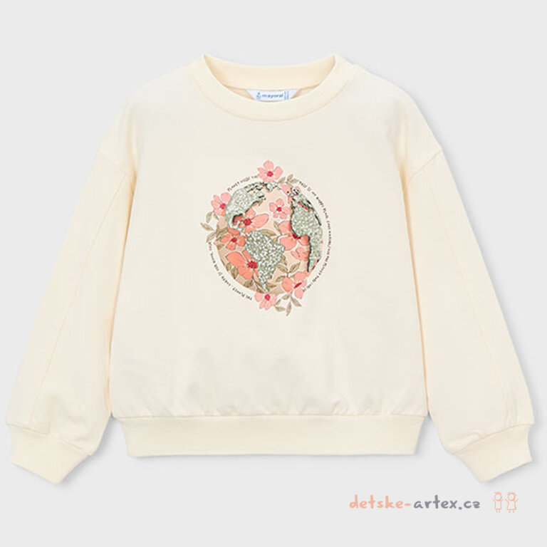 Dětská mikina přes hlavu Mayoral 3448-94 je určena pro holčičky, které ocení pohodlí a styl. Mikina je vyrobena z kvalitního, slabšího bavlněného materiálu, který je příjemný na dotek a zajišťuje komfort po celý den. Jemná smetanová barva dodává mikině něžný a moderní vzhled. Design zdobí poutavý potisk planety Země s nápisem, který podporuje vztah k přírodě. Tato mikina je praktická, stylová a vhodná pro každodenní nošení.
