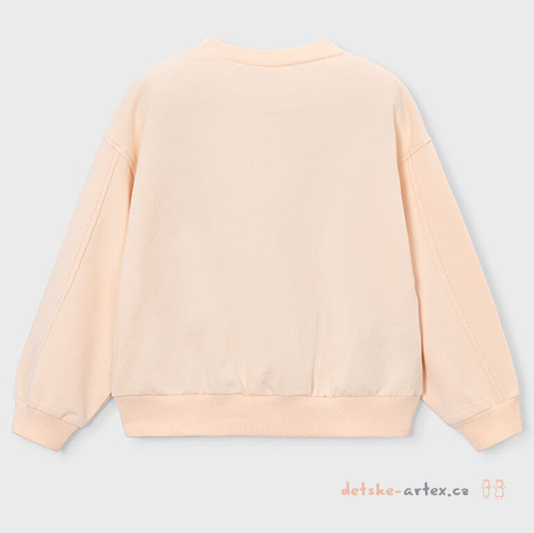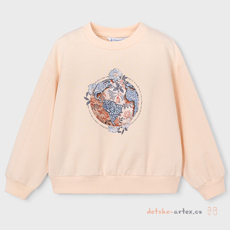 Dětská mikina přes hlavu Mayoral 3448-96 je určena pro malé slečny, které ocení pohodlí a styl. Mikina je vyrobena z kvalitního, slabšího bavlněného materiálu, který je příjemný na dotek a zajišťuje komfort po celý den. Jemný odstín lososové barvy dodává mikině něžný a moderní vzhled. Design zdobí poutavý potisk planety Země s nápisem, který podporuje vztah k přírodě. Tato mikina je praktická, stylová a vhodná pro každodenní nošení.