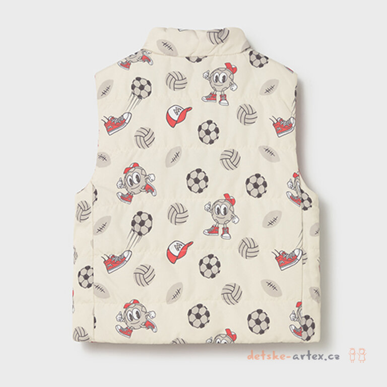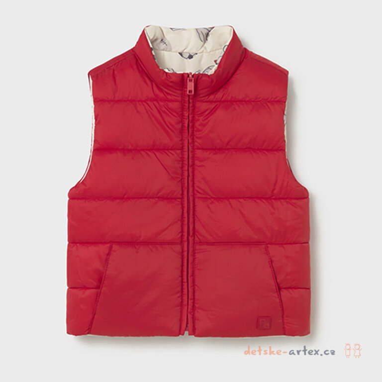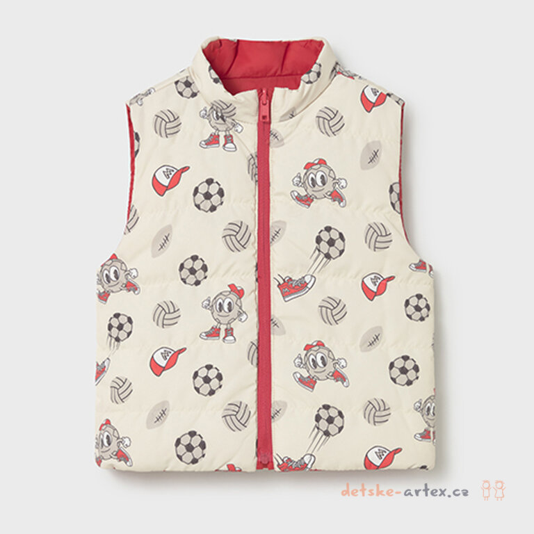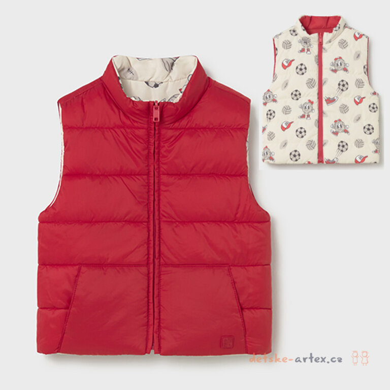 Lehká oboustranná dětská vesta na přechodné období je z jedné strany červená a z druhé strany s veselými smajlíky.