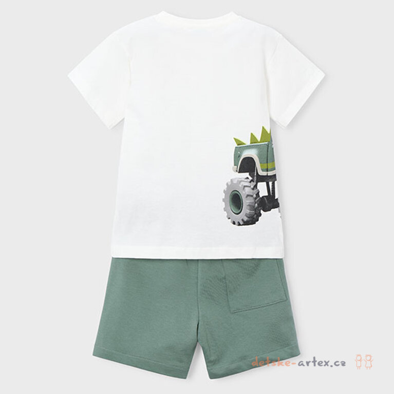 Dětské tričko s kraťasy Mayoral 3605-39 je ideální volbou pro aktivní letní dny vašich dětí. Tričko zdobí originální obrázek monster trucku, který z boku přechází až na záda, což dodává zajímavý a hravý efekt. Součástí setu jsou zelené olivové kraťasy vybavené pohodlným širokým pasem na pruženku se šňůrkou pro snadné přizpůsobení. Kraťasy mají praktické boční kapsy i jednu zadní kapsu pro uschování drobností. Celý komplet je vyroben ze 100 % bavlny.