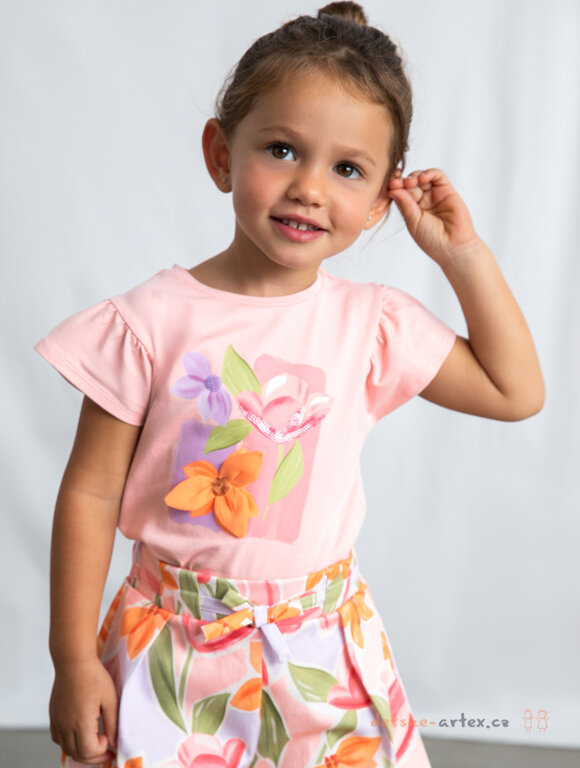 Dětské tričko s květinami Mayoral 3007-83 v luxusním provedení rozzáří letní dny vaší malé slečny. Tričko je vyrobeno z kvalitního a příjemného materiálu, který zajišťuje pohodlí po celý den. Volánkové krátké rukávky dodávají modelu hravý a elegantní vzhled. Na tričku je krásný květinový potisk zdobený jemnými flitry a originální našitou šifónovou oranžovou kytičkou, která zvýrazňuje jeho jedinečnost. Toto tričko kombinuje styl a komfort, díky čemuž je perfektní pro dětskou letní garderobu.