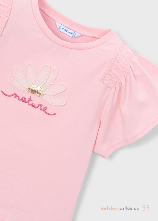 Dětské tričko Mayoral světlé růžovo-meruňkové barvy s aplikací květu, volnými rukávky a příjemným materiálem pro letní pohodlí.
