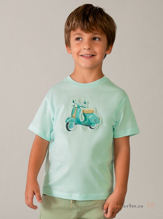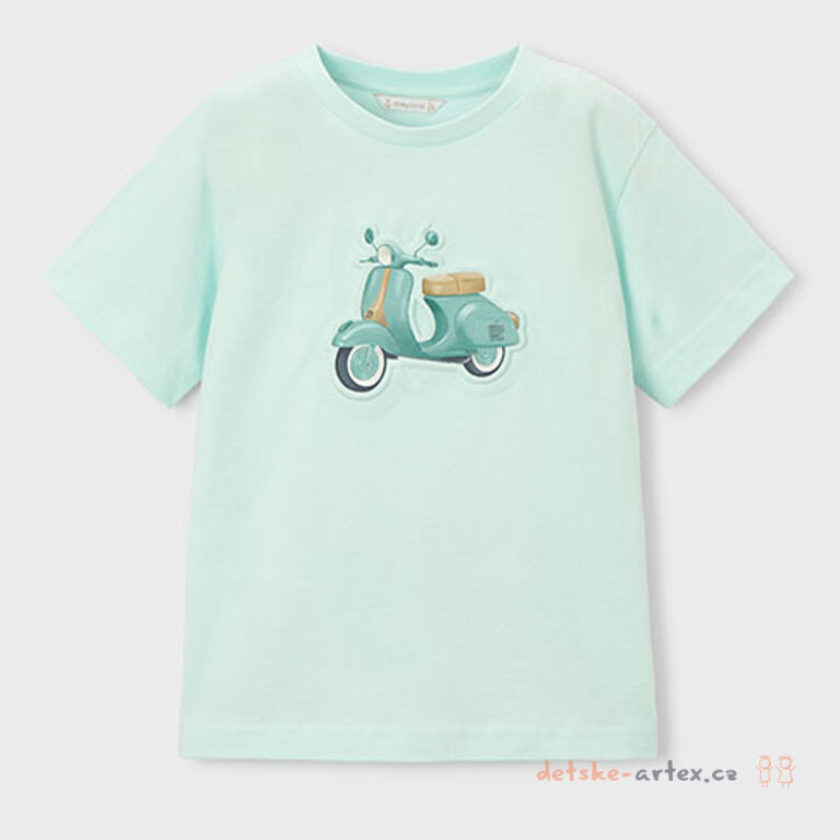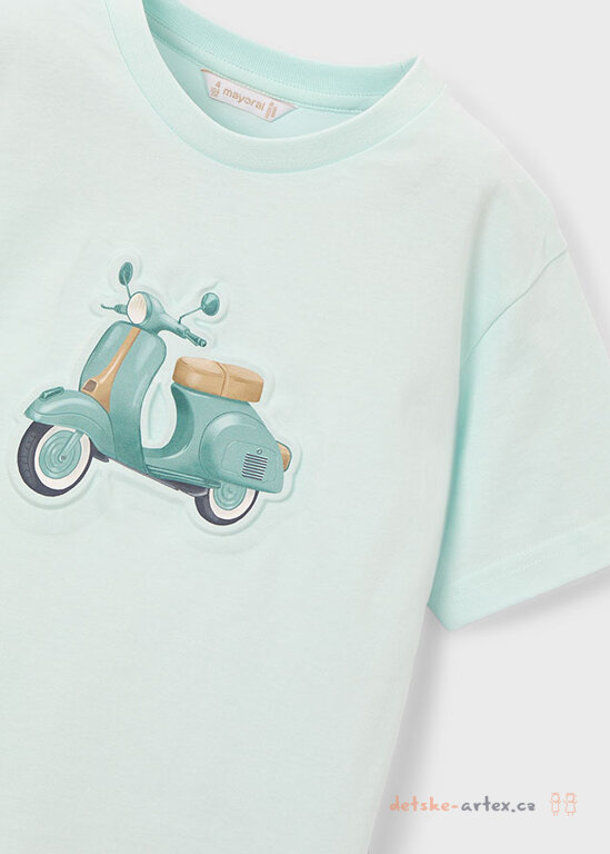 Dětské tričko s obrázkem skútru Mayoral 3059-25 pro malé milovníky motorek je vyrobeno ze 100% kvalitní bavlny, která zajišťuje příjemný pocit na pokožce i během horkých letních dní. Krásná mentolová barva dodává triku svěží a moderní vzhled.