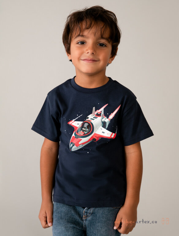 Dětské tmavě modré tričko s vesmírnou lodí řízenou robotem, kvalitní potisk, 100% bavlna,