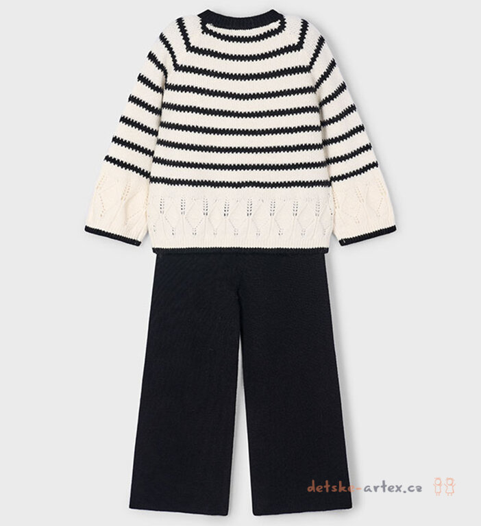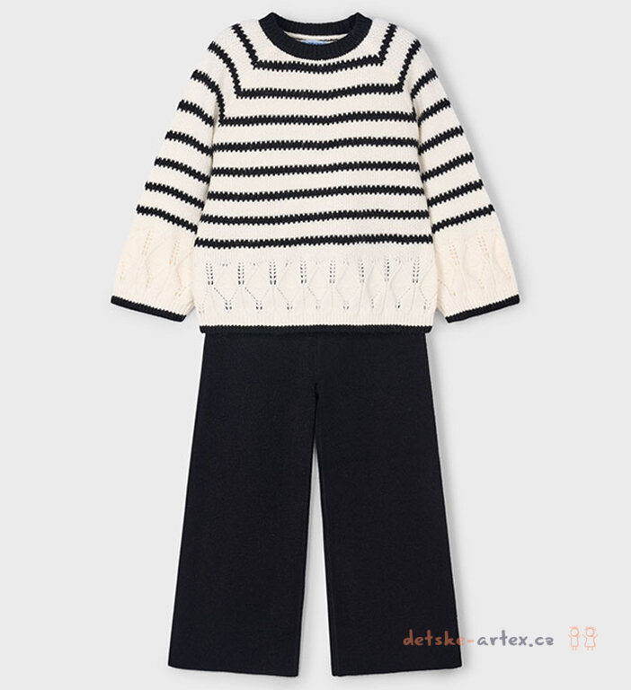 Dětský pletený komplet Mayoral 4582-87 nabízí pohodlí a styl v jednom. Skládá se z pruhovaného svetru zdobeného vzorem a hladkých pletených černých kalhot volnějšího střihu, které zajišťují volnost pohybu. Kalhoty mají širokou pruženku v pase pro snadné oblékání a perfektní padnutí. Kompletní outfit je vyroben z příjemného materiálu, který je šetrný k dětské pokožce a vhodný pro každodenní nošení.
