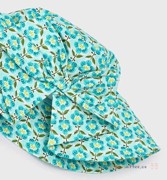 Květinový motiv v kombinaci modré a zelené barvy dodává klobouku svěží vzhled. Design je doplněn o stylovou mašli na zadní straně, která přidává výrobku elegantní detail.