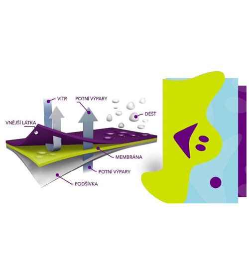 - materiál hřejivý, paropropustný, vodoodpudivý, sendvičová textilie, úprava-membrána TPU