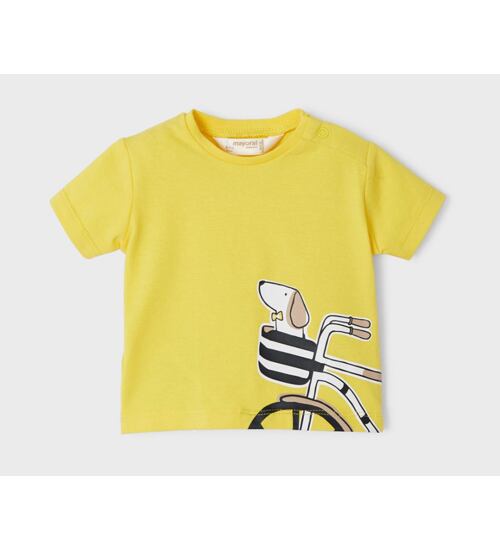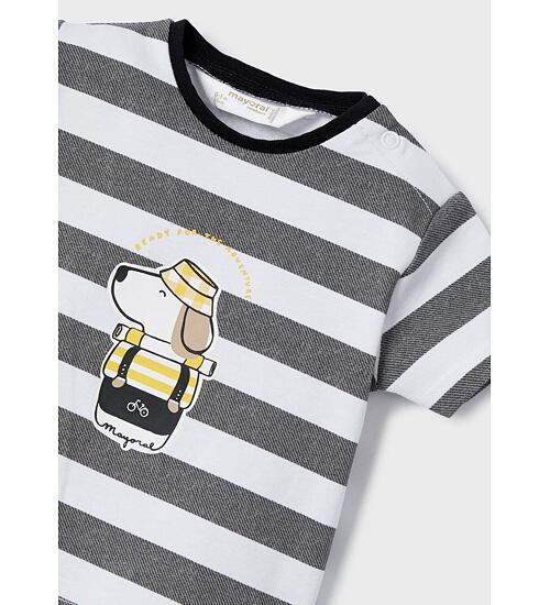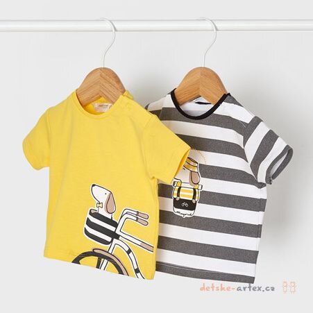Trička z kolekce Newborn módní značky Mayoral. Žluté triko s pejskem v košíku a pruhované triko v bílošedé kombinaci.