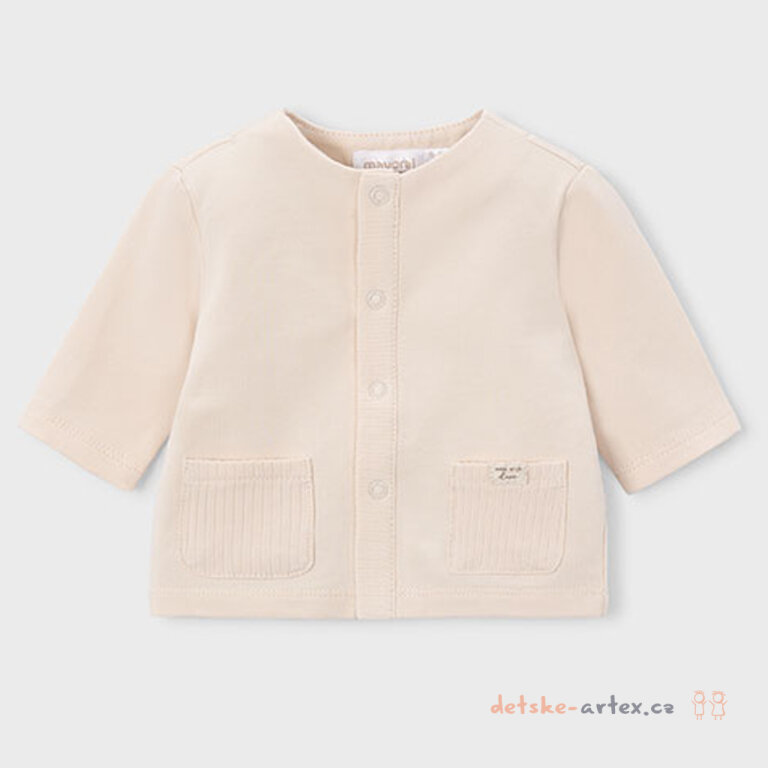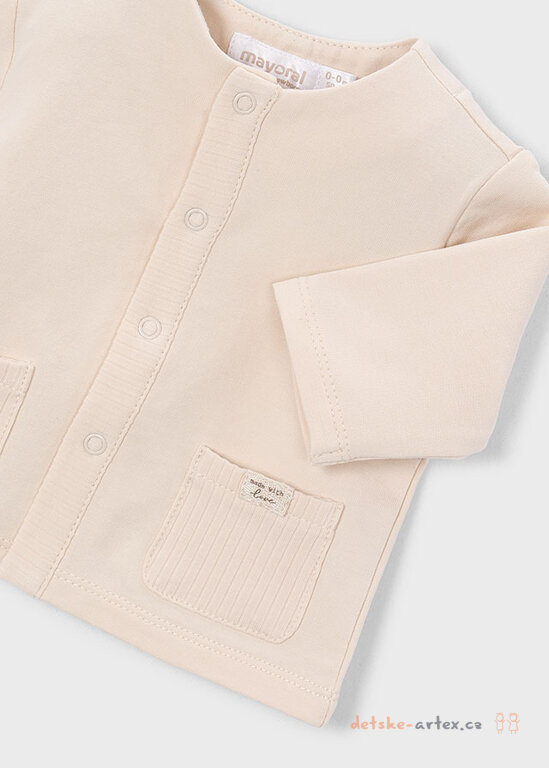 Kojenecká mikina Mayoral v neutrální béžové barvě, s praktickým zapínáním na baby patenty a stylovými kapsičkami pro nejmenší miminka.