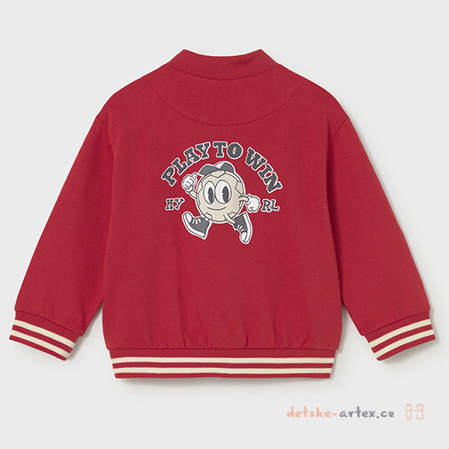 Mikina na zip bez kapuce je praktickým kouskem pro miminka na každodenní nošení. Červená mikinka má na přední i zadní straně veselý obrázek, který dodává mikině hravý a originální vzhled.
