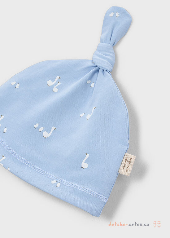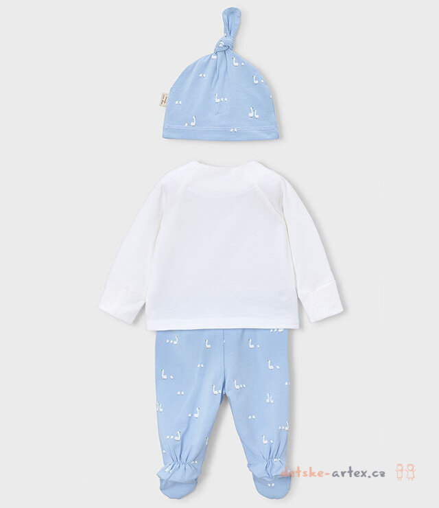 Kojenecká souprava do porodnice Mayoral 1506-75 v modrobílé kombinaci je ideální volbou pro první dny vašeho miminka. Souprava obsahuje polodupačky s vysokým, pohodlným a ohrnovacím pasem, které zajistí, že se děťátku budou dobře nosit a nebude ho nic tlačit. Dále je součástí celorozepínací tričko, které lze využít také jako slabou mikinku. Soupravu doplňuje měkká čepička s uzlem. Všechny kousky jsou ozdobeny něžným motivem labutí, který dodává celému setu jemný a elegantní vzhled.