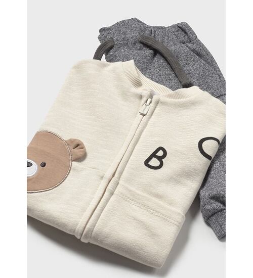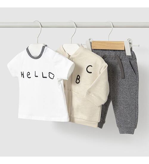 Kvalitní mikina na zip, tepláčky a tričko, to je krásně sladěná soupravička španělské značky Mayoral.