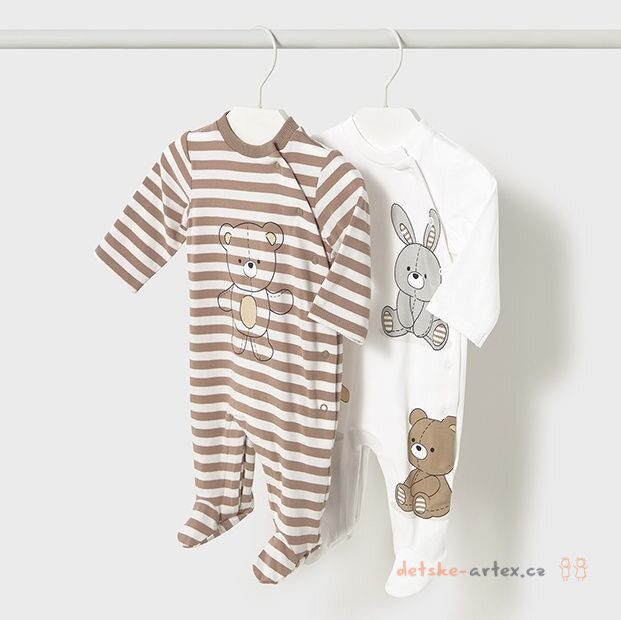 Overaly s motivy medvídků od španělského výrobce Mayoral v kolekci Newborn. V balení dva overaly s praktickým bočním zapínáním pro snadné oblékání a miminka.