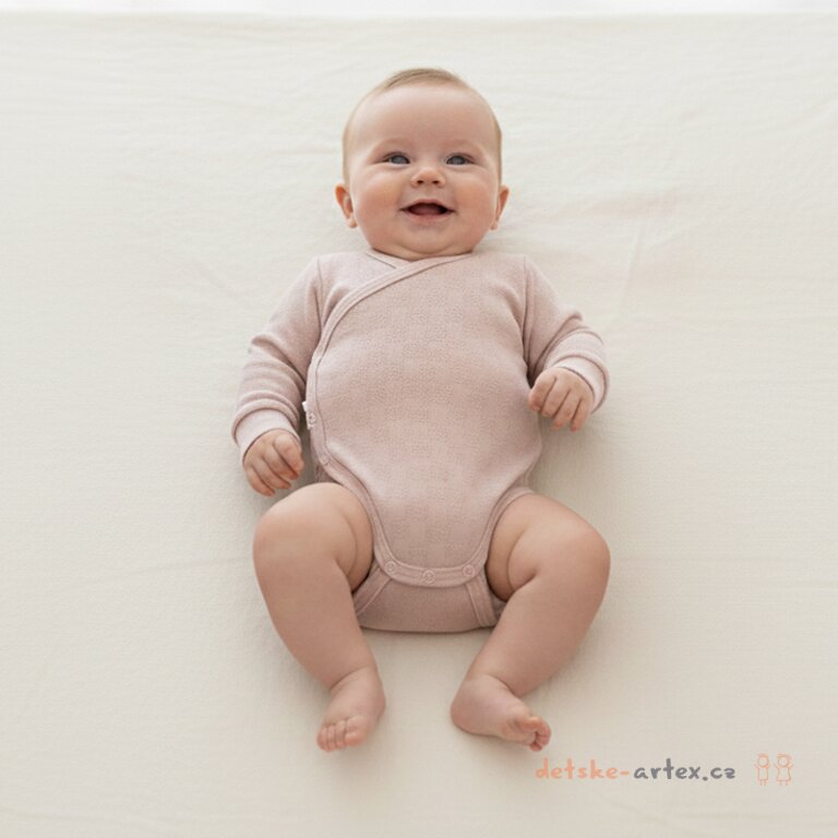 Kojenecké rostoucí zavinovací bodyčko v růžové pudrové barvě je vyrobeno z kvalitního 100% bavlněného úpletu s decentním vzorem drobných obdélníků, který je příjemný k citlivé dětské pokožce. Tento český výrobek nabízí praktické řešení díky dvojí řadě baby patentů mezi nožičkami, které umožňují snadné nastavení délky podle velikosti miminka, čímž bodyčko roste společně s dítětem. Dlouhé náplety na koncích rukávů lze ohrnout a přizpůsobovat tak, aby dokonale seděly při různých fázích růstu dítěte. Tento produkt kombinuje pohodlí, funkčnost a dlouhou životnost, což ocení každá maminka.
