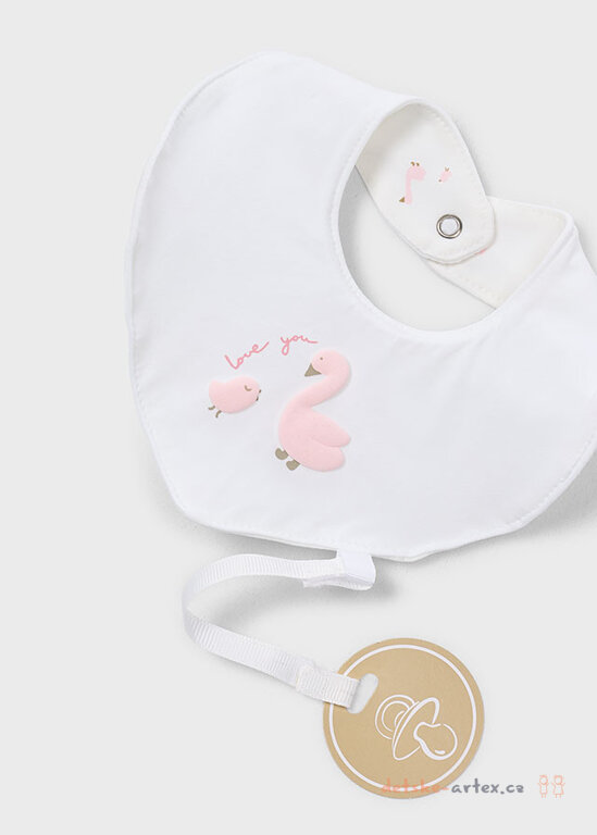 Letní kojenecký komplet Mayoral obsahuje růžový overal, nepromokavý slintáček s úchytem na dudlík a měkké ponožky pro pohodlí holčiček.