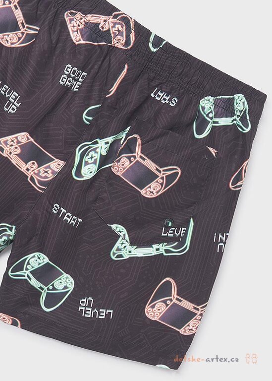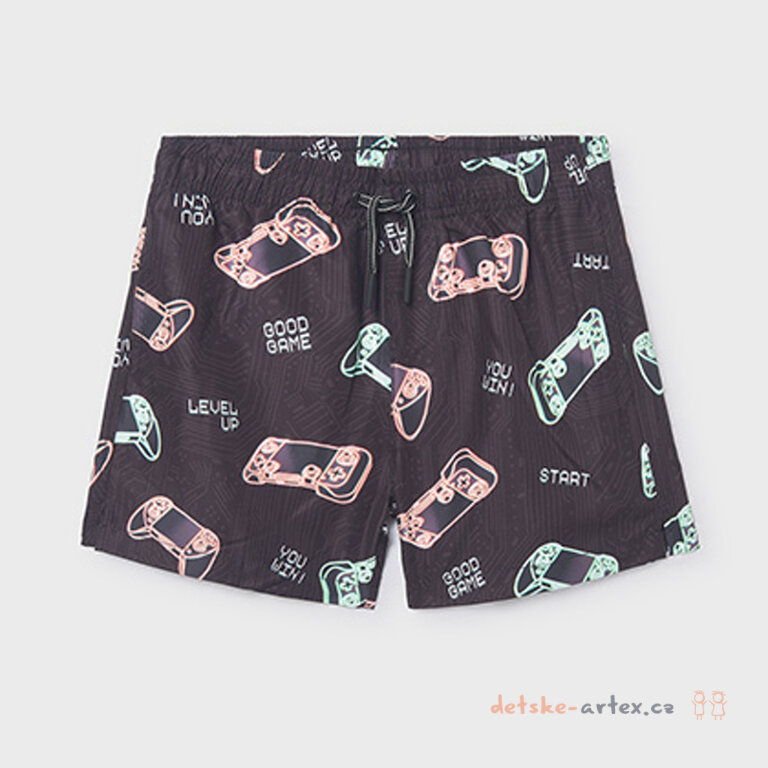 Černé koupací kraťasy Mayoral s pohodlným pasem, barevným potiskem a síťovanými slipy pro každý přijemný den u vody.