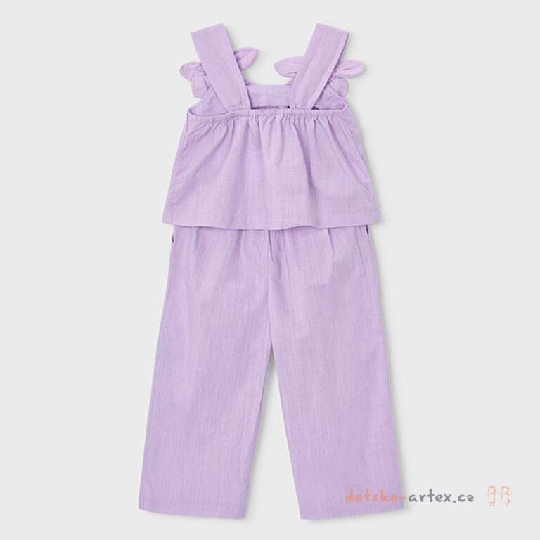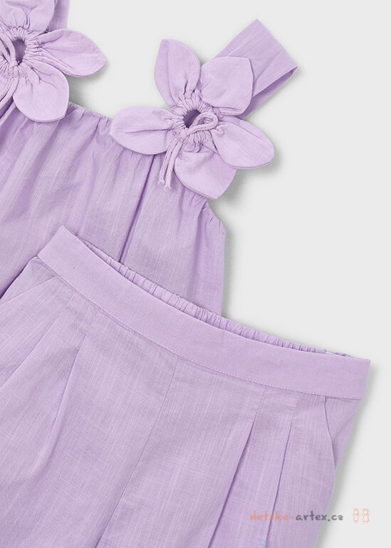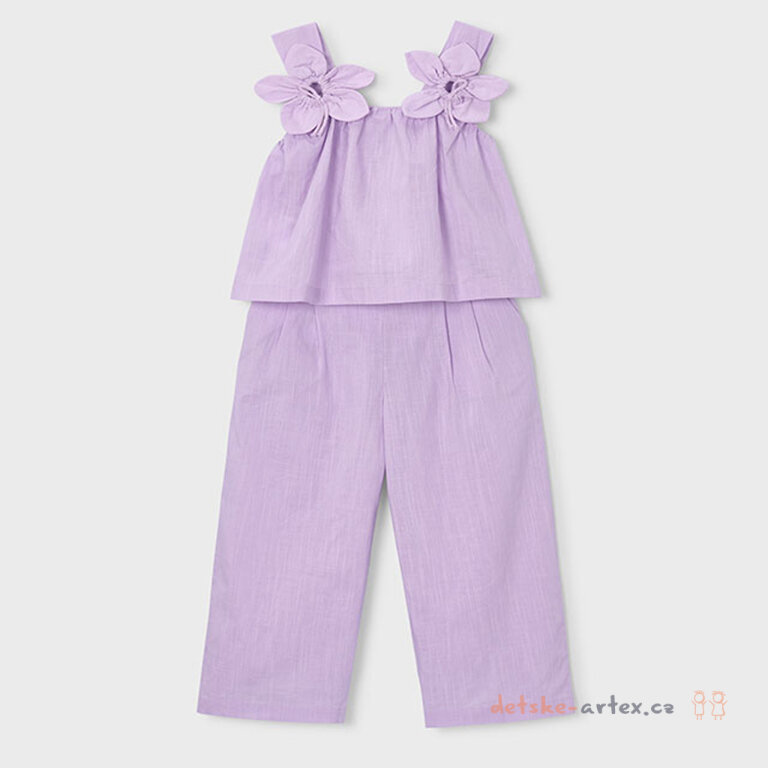 Letní komplet Mayoral 3596-11 ve světle fialové barvě nabízí dokonalé spojení pohodlí a stylu pro teplé dny. Skládá se z lehkého vzdušného topu s originální květinovou ozdobou, která dodává celku svěží a hravý vzhled. Široké culottes kalhoty jsou vyrobeny ze slabého plátěného bavlněného materiálu, který je příjemný na dotek a zaručuje optimální prodyšnost. Kalhoty mají volný kratší střih a praktické stažení vzadu do široké pruženky, což zajišťuje pohodlné nošení bez nutnosti zapínání.