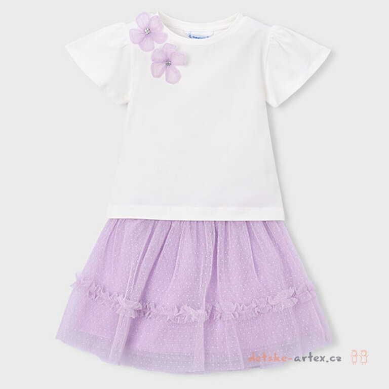 Objevte letní komplet s tylovou sukní Mayoral 3946-81, který kombinuje styl a pohodlí pro teplé dny. Tento luxusní outfit od španělské značky Mayoral zahrnuje světle fialovou tylovou sukni se dvěma vrstvami – vrchní s jemným puntíčkem a hladkou spodní vrstvou, pod kterou se nachází spodnička ze slabého plátýnka pro maximální pohodlí.