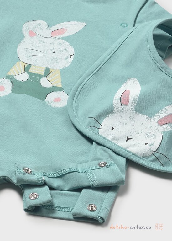 Vyroben je z kvalitního, lehkého a prodyšného materiálu, který zajišťuje pohodlí a svobodu pohybu vašeho dítěte. Slintáček je nepromokavý a je ozdobený hlavičkou zajíčka, která ladí s obrázkem zajíčka na overalu.
