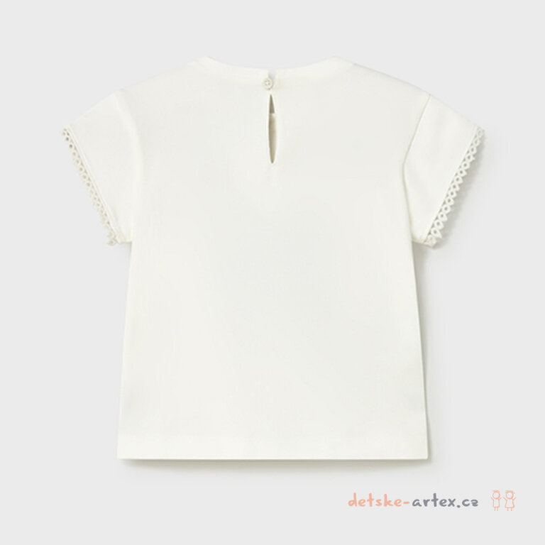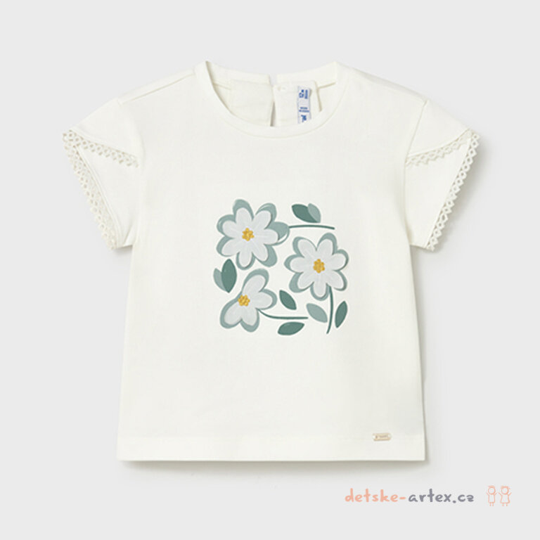 Letní tričko Mayoral 1079-91 je skvělou volbou pro slunečné dny. Tričko je vyrobeno z kvalitního pružného materiálu, který zajišťuje pohodlí a volnost pohybu. Na potisku květin jsou našité šifónové bílé květy s vyšívaným žlutým středem, které dodávají tričku elegantní a hravý vzhled. Rukávky jsou ozdobně lemovány, což podtrhuje jemnost a styl tohoto letního kousku.