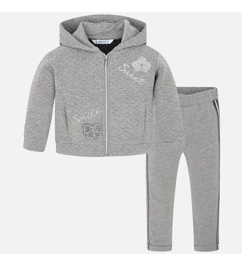 Nevšední městská tepláková souprava v luxusním provedení módní značky Mayoral. Souprava z kvalitního materiálu s třpytivým lurexem a kamínkovým štrasovým zdobením. I malé holčičky se mohou sportovně oblékat podle poslední módních trendů :)