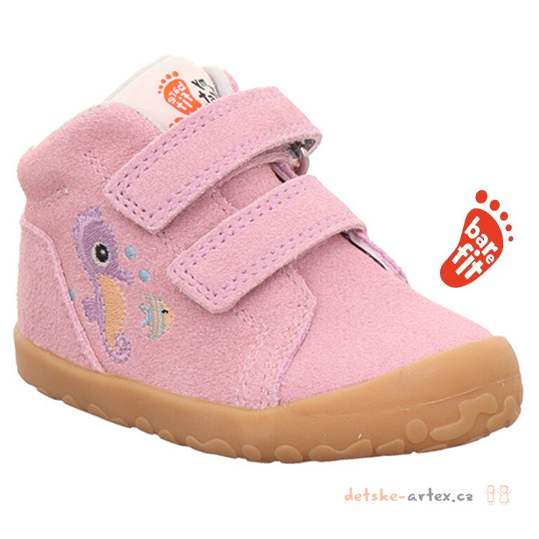 Růžové barefoot kožené botičky s pružnou podrážkou, lehké, pohodlné, s praktickým zapínáním na suché zipy a ochranou špice.